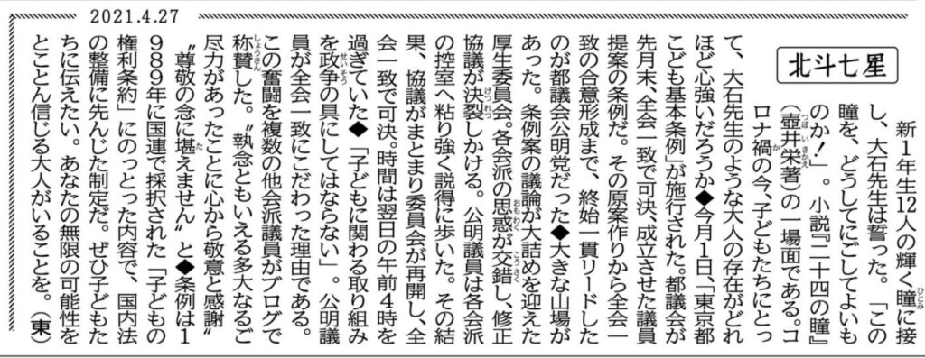 本日の公明新聞一面のコラム「北斗七星」には、「東京都こども基本条例」制定までの道のりがよくまとまって綴られていました。以下にご紹介させていただきます。