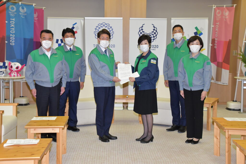小池知事(中央右)に緊急要望する都議会公明党=11日 都庁