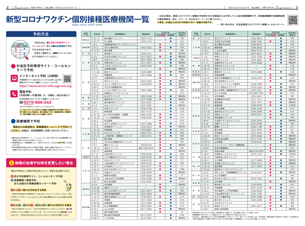 新型コロナワクチン個別接種が可能な区内117ヶ所の医療機関(6月2日現在)が掲載されている「広報すぎなみ6月11日号(臨時号)」が本日より全戸配布されます。