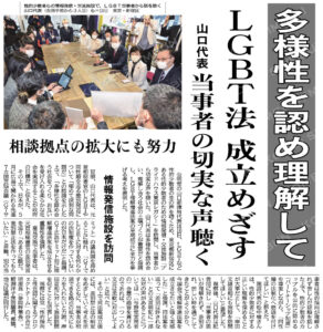 山口代表は、多様性を認め合い、理解し合う社会の社会の土壌づくりが重要だと指摘し、LGBT理解増進法案の早期成立に全力を挙げると述べました。本日の公明新聞に詳しい内容が掲載されております。